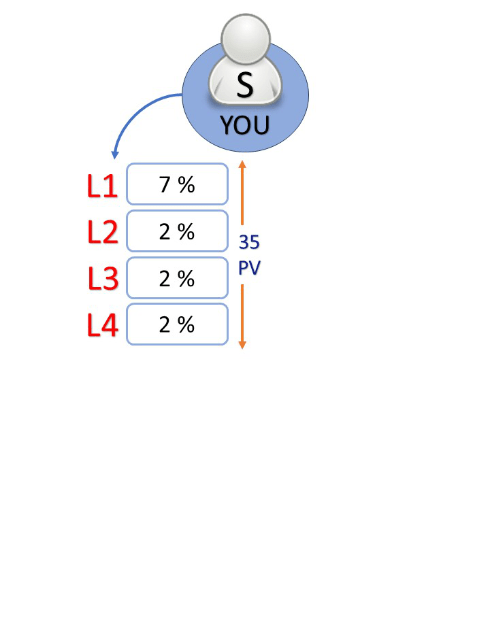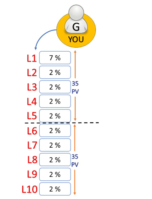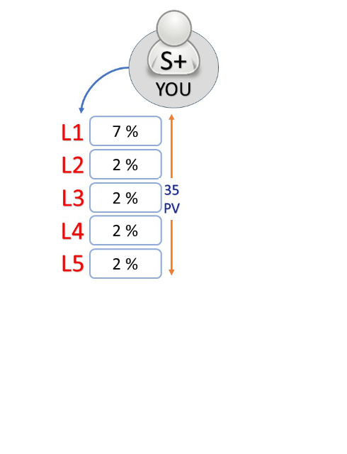 Jika anda ahli Gold, anda akan nikmati: 15% S&P Bonus dari Level 1 hingga 5 bila anda beli 1 kotak (35PV). Dan tambahan 10% lagi dari Level 6 hingga 10, jika anda buat pembelian 2 kotak (70PV) pada bulan itu.